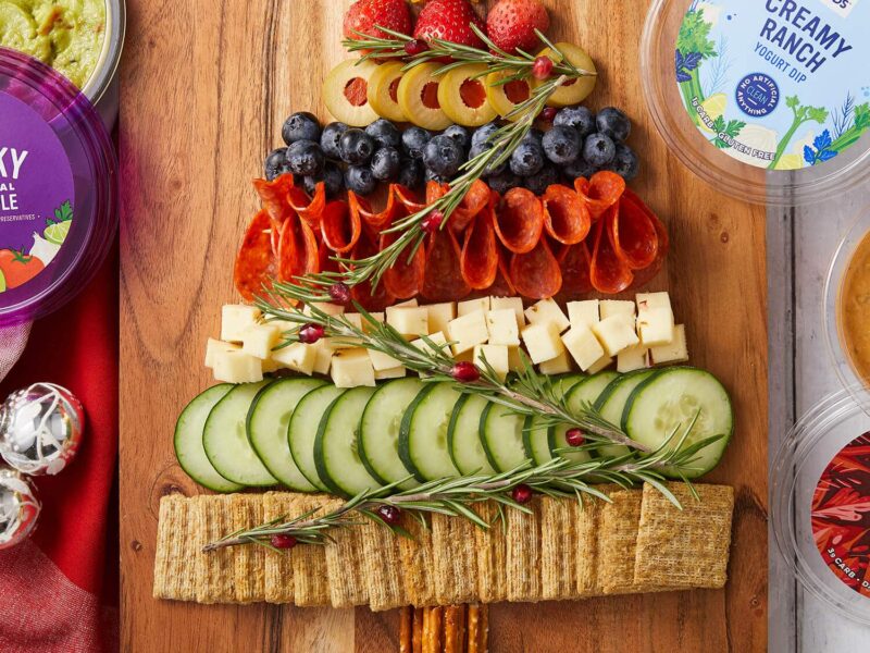 • Whisk together Good Foods Creamy Ranch Yogurt Dip, minced onion, dill, chives, black pepper, and garlic powder. Gently toss with halved potatoes to coat. Sprinkle with bacon and cheddar cheese.