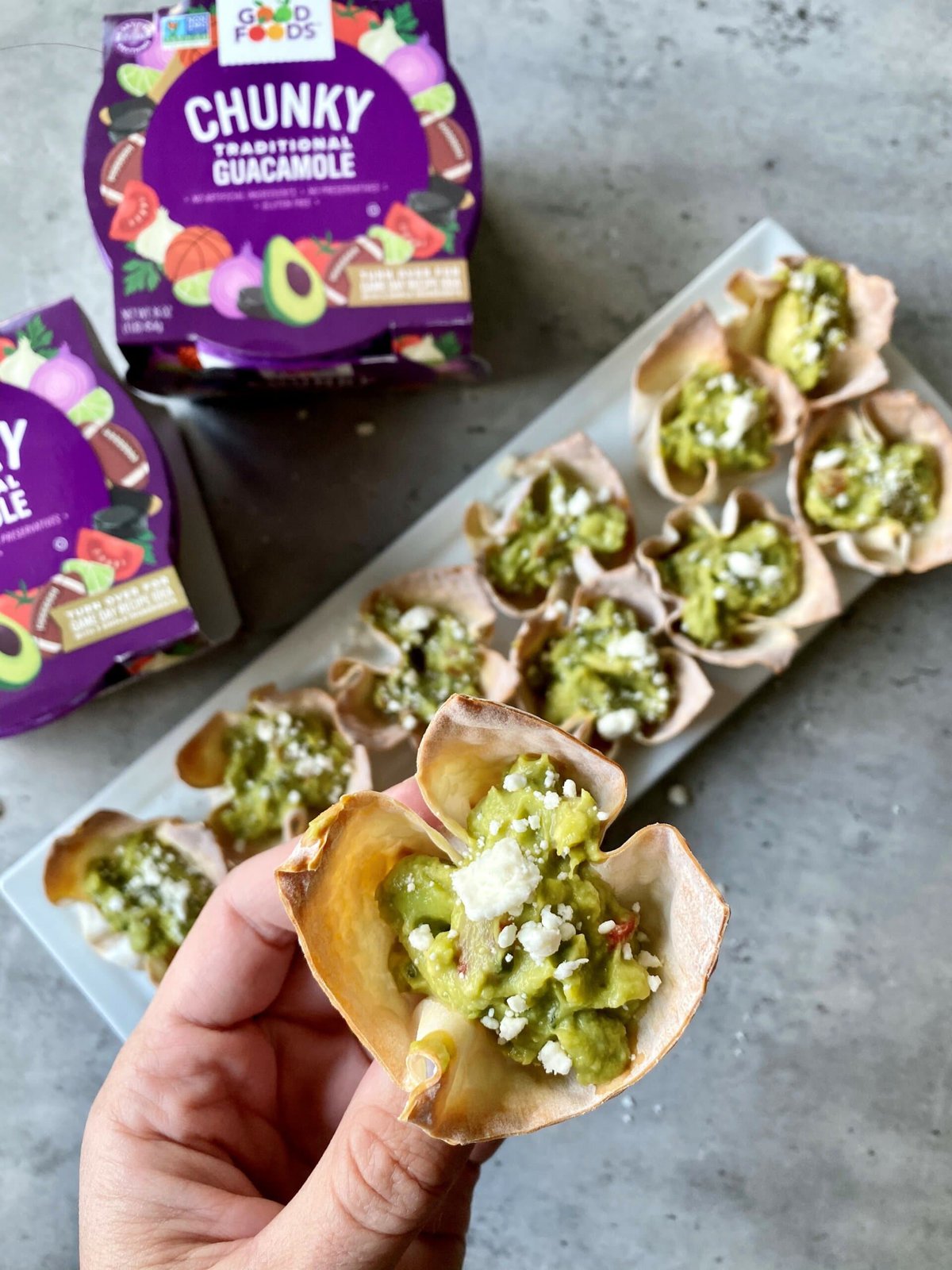 • Fill each wonton cup with Good Foods Chunky Guacamole. Top with feta cheese and bacon bits.