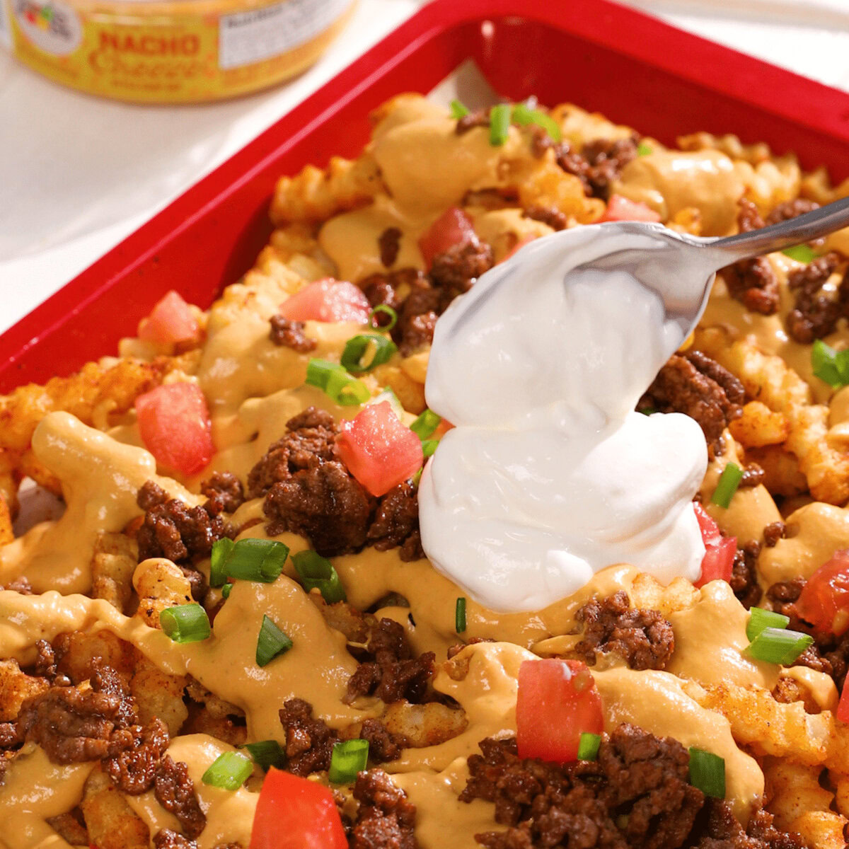 • Top fries with cooked ground beef, Good Foods Nacho Cheeze Style Chip Dip, sour cream, tomato and green onions. Serve and enjoy.