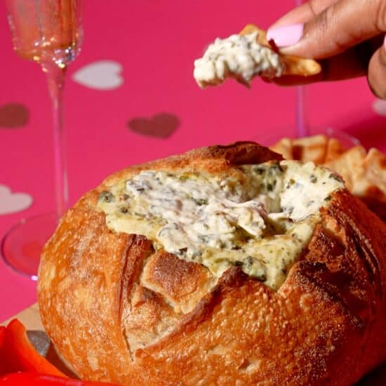 The perfect Galentine's snack, made with Good Foods Spinach Artichoke Parmesan Dip.