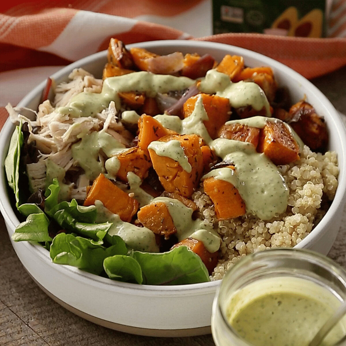 - Assemble bowls equally with salad greens, quinoa, chicken, sweet potatoes and top with avocado tahini dressing. Garnish with slivered almonds.
