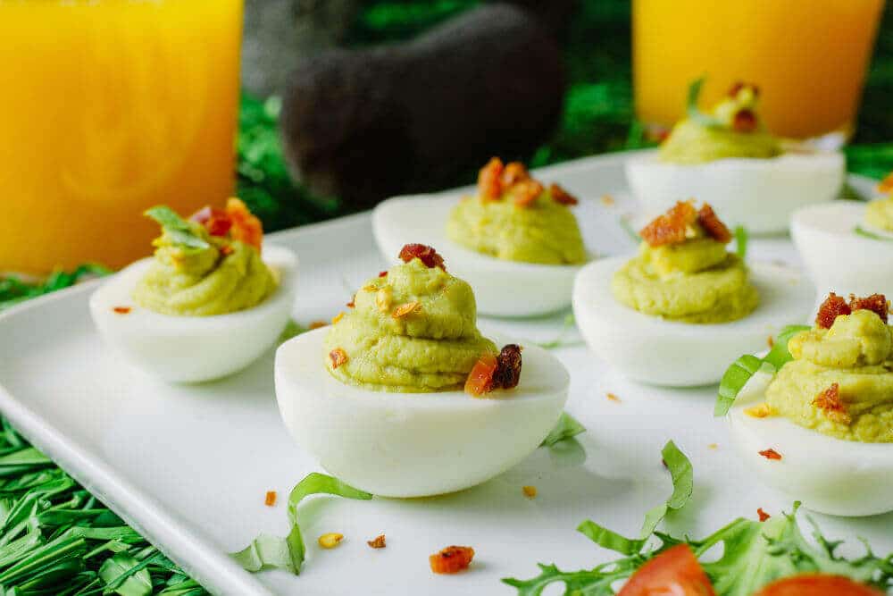 - Pipe the mixture into the eggs, garnish with chopped bacon and cilantro and serve