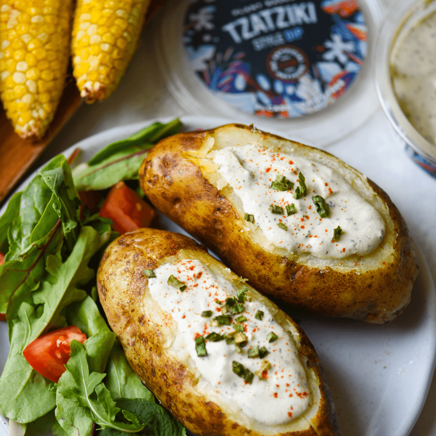 - Top with Tzatziki dip, paprika and dried or fresh chives. Enjoy!