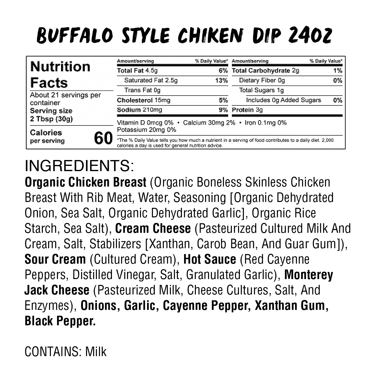 This creamy blend of chicken, cheese and spices comes together to create this savory dip. Perfect for dipping veggies, chips or to top on any of your favorite dishes for a bit of heat. Only 60 calories per serving, no sugars added and 2 grams of carbohydrates.